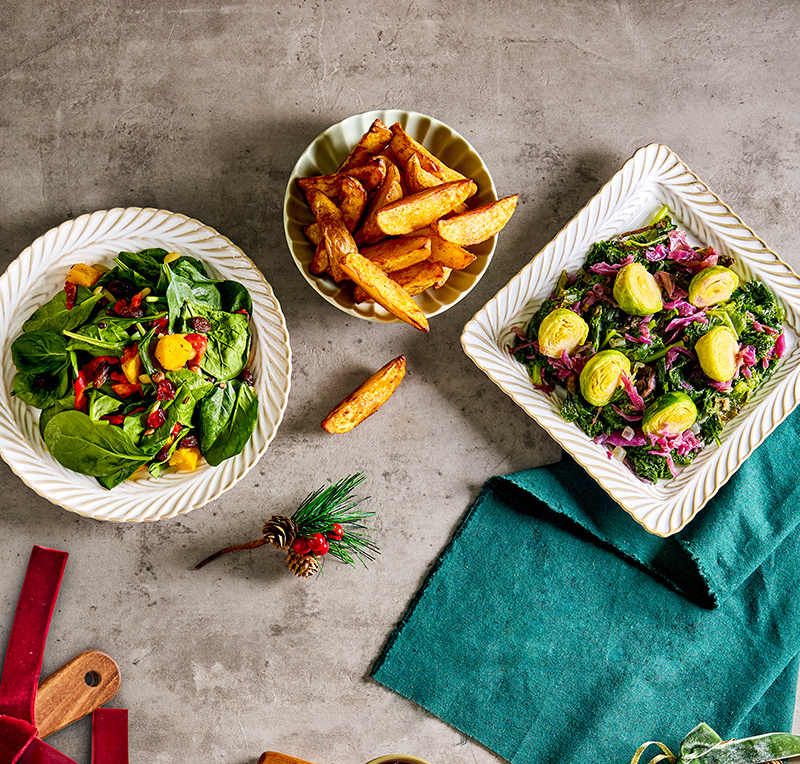 A trio of roasted vegetables (Brussels sprouts, kale, and red cabbage) with glazed onion, paired with a Merry Berry Spinach Salad featuring fruit and nuts, and Roast Garlic and Herb Potatoes.